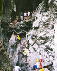 Later in the day, the group made their way home using a different route. We climbed down the steep slope from the cave entrance directly to the base of the hill where pre-viously we had negotiated a labyrinth of tunnels and narrow caves.