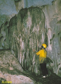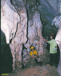 "Just like riding a horse" quipped Chang as he waited patiently in the chamber to guide us up. The hole that opened into the floor of the entrance is the size and shape of a toilet bowl. Two experienced cavers, Michael Liew and Ong Boo Kuan, who went up earlier, had a busy time playing "midwife" to subsequent cavers coming through. Not relishing this bit of challenge, about half the group decided not to make this difficult climb down. They thought it would be safer to sit outside the cave and enjoy the scenery. The brave ones who successfully made it into the upper cave were welcomed by some interesting rock formations. After a couple of s-bends and a climb up a slippery ramp, the passage opened into a chamber about 20m in diameter and 5m high. A small skylight illuminated the chamber, home to about a hundred bats. A 4m high flowstone in the shape of a jellyfish presented a rewarding find. | ![]() White flowstones |